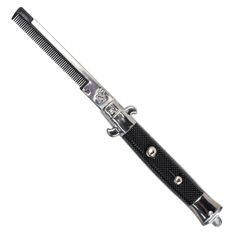 - 9 inch folding pocket comb that are individually wrapped and easy to operate. Slide down the small button to unlock then push button for quick comb with handle ejection.